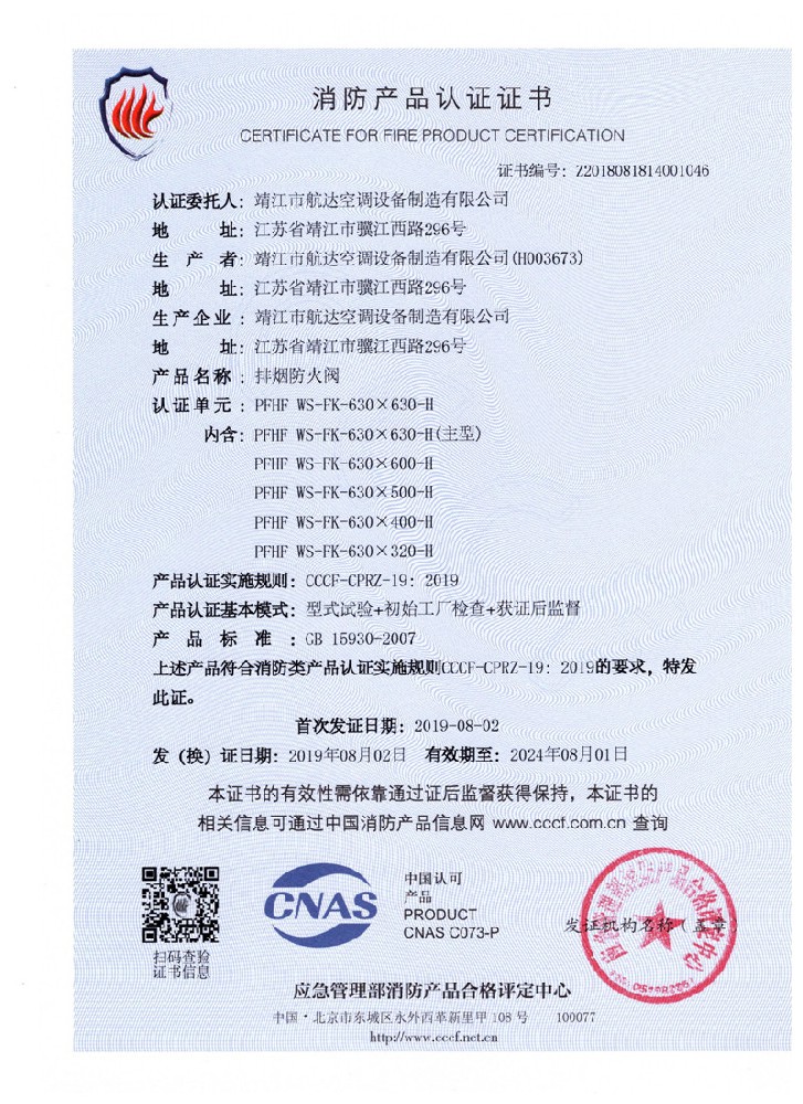 排煙防火閥證書